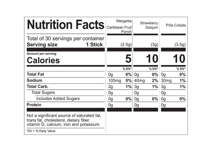 MARGARITA: CITRIC ACID, MALTODEXTRIN*, SALT, NATURAL FLAVOR, ASPARTAME†, CONTAINS 2% OR LESS OF THE FOLLOWING: ACESULFAME POTASSIUM, CELLULOSE GUM, PECTIN, ARTIFICIAL COLOR, MAGNESIUM OXIDE, YELLOW 5.