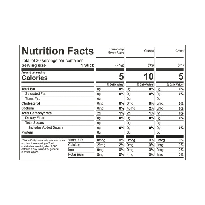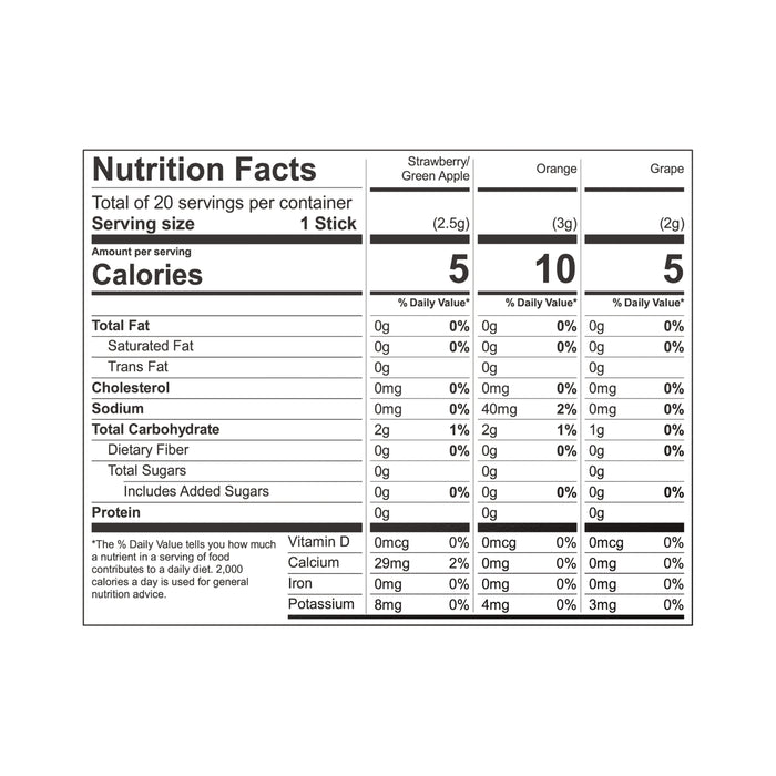 GREEN APPLE: CITRIC ACID, ASPARTAME†, MALTODEXTRIN*, MONOCALCIUM PHOSPHATE, NATURAL AND ARTIFICIAL FLAVORS, MAGNESIUM OXIDE, CONTAINS 2% OR LESS OF THE FOLLOWING: ACESULFAME POTASSIUM, ARTIFICIAL COLOR, YELLOW 5, BLUE 1.