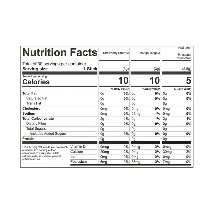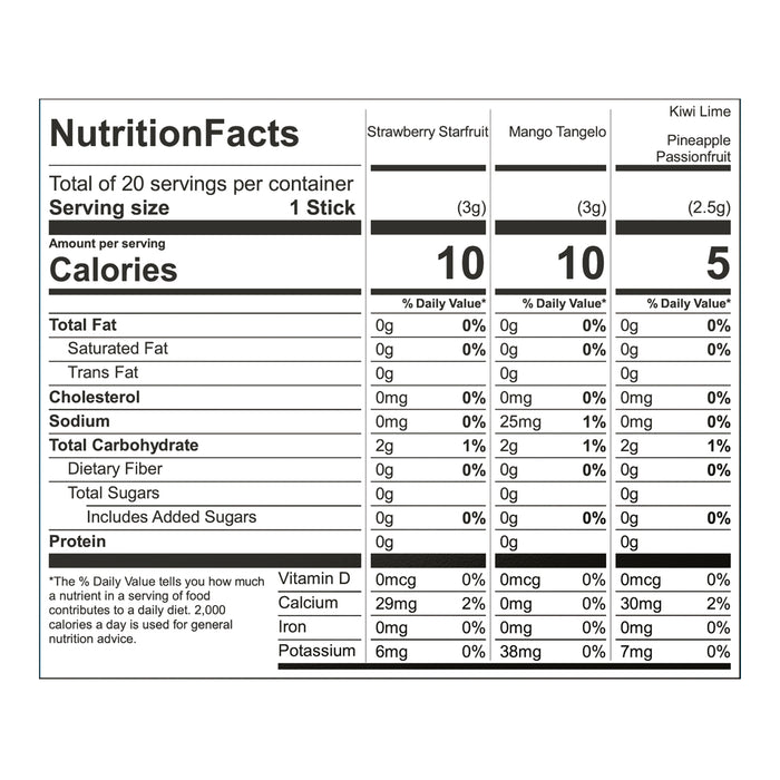 PINEAPPLE PASSIONFRUIT: CITRIC ACID, ASPARTAME†, MALTODEXTRIN*, MALIC ACID, MONOCALCIUM PHOSPHATE, NATURAL AND ARTIFICIAL FLAVORS, CONTAINS 2% OR LESS OF THE FOLLOWING: MAGNESIUM OXIDE, ACESULFAME POTASSIUM, CALCIUM SILICATE, ARTIFICIAL COLOR, BLUE 1, RED 40.