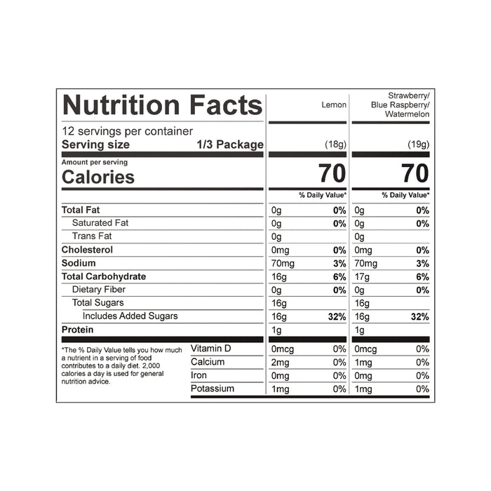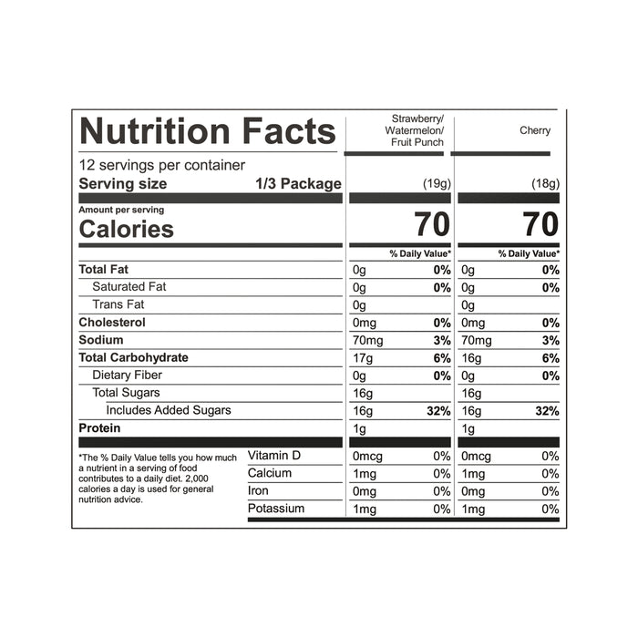 FRUIT PUNCH: SUGAR, GELATIN, CONTAINS 2% OR LESS OF THE FOLLOWING: FUMARIC ACID, SODIUM CITRATE, NATURAL AND ARTIFICIAL FLAVORS, SUCRALOSE, ACESULFAME POTASSIUM, RED 40, BLUE 1.