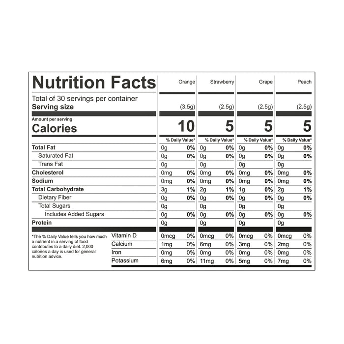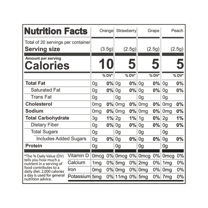 PEACH INGREDIENTS: CITRIC ACID, NATURAL AND ARTIFICIAL FLAVORS, MALTODEXTRIN*, ASPARTAME†, MALIC ACID, CONTAINS 2% OR LESS OF THE FOLLOWING: MAGNESIUM OXIDE, ACESULFAME POTASSIUM, CALCIUM SILICATE, ARTIFICIAL COLOR, RED 40, YELLOW 5.